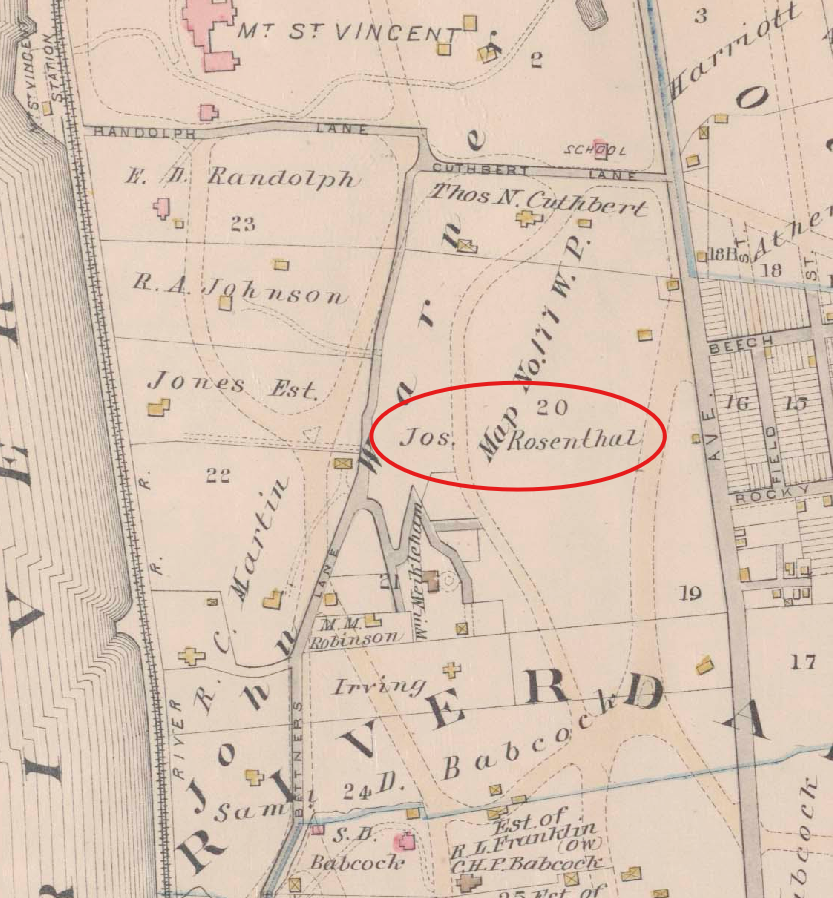 I consulted the 1880 census and found a listing for someone named Joseph Rosenthorn living near Sigma Place. Cross-referencing it to an 1885 map, you can see that much of the land in that section was owned by someone named Joseph Rosenthal. One of these names was probably a typo. Looking at the land deeds, I saw that the correct name was Joseph Rosenthal, not Rosenthorn, who owned the land known as Jew Hill. The census listed him as a flower merchant, who was born in Bavaria around 1827. He was married to Clara, also of Bavaria, and the couple had three kids. The deeds indicate that he was living in New York City prior to his first land purchase in Riverdale in 1869. Joseph Rosenthal seems like a very plausible Jewish name but I could not find any additional biographical information about him to confirm this. So I have hit a dead end. If anyone feels like digging deeper into this, please let me know if you find anything. Rosenthal is the most promising lead I’ve found that explains the name “Jew Hill.”