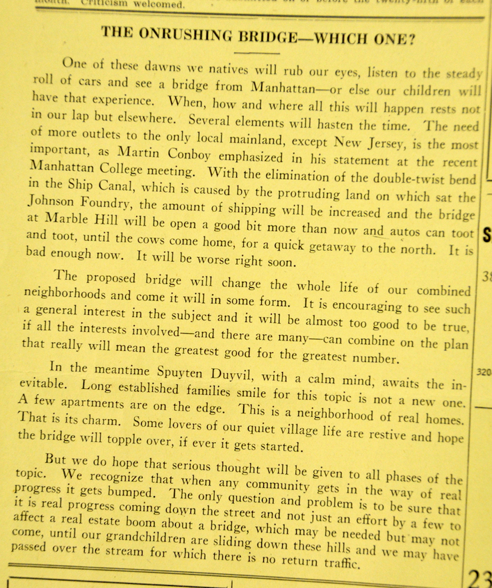 And there was a big split in the neighborhood regarding the impact of the Henry Hudson Bridge and Parkway (and yet the author admits that “this topic is not a new one”):
