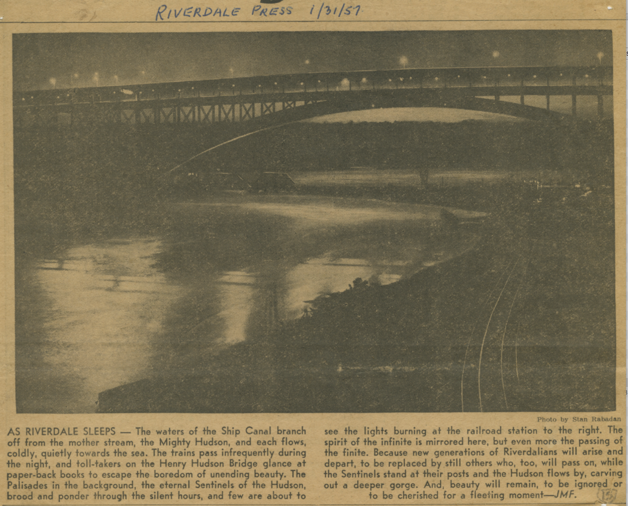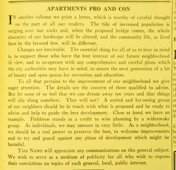 I feel like I have had very similar ideas when taking in the vista at Spuyten Duyvil station. The author’s reflective mood on change and permanence made me think about historical attitudes toward changes in the neighborhood. The Riverdale Press runs multiple stories per week about some new building going up and some others coming down. That is a continuation of a conversation that began a lot earlier around how much change can be accommodated without causing congestion, overcrowding, or lack of green spaces. The Riverdale News in the 1920s printed stories showing a collective anxiety about the possibility of apartment buildings going up in Riverdale: