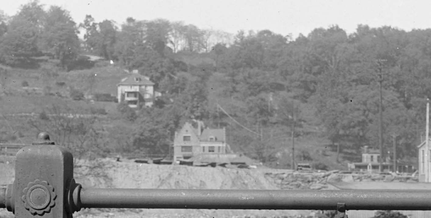 Believe the location of the iron railing in foreground of the 1915 photo indicates it was taken from the Godwin Island bridge that once ran parallel to Broadway at 230th Street over the old Spuyten Duyvil creek at that time filled in.  Today the bridge would have been  from Dunkin Donuts south across 230th St  to SW corner and Marble Hill houses.